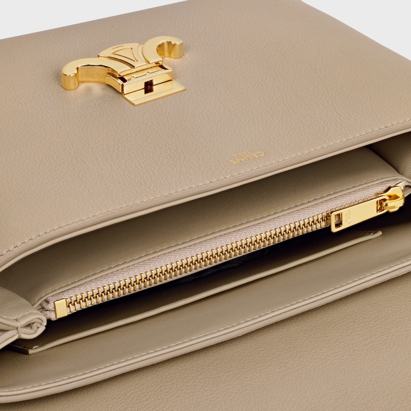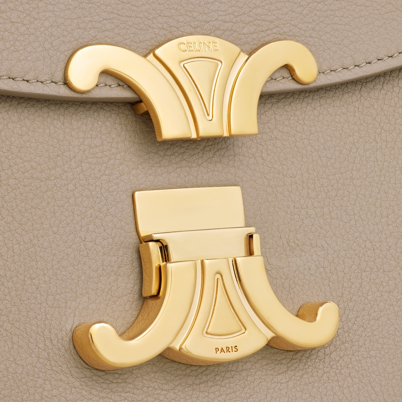 10 x 7 x 4英寸(25 x 17.5 x 10厘米)牛皮革羊皮革衬里手提、肩背和斜挎TRIOMPHE金属锁扣2个隔层3个内侧扁平口袋 1个内侧中央拉链口袋1个皮革提手长4英寸(9厘米)1条可拆卸和可调节肩带,最小长度18英寸(45厘米),最大长度21英寸(54厘米)编号:117523FXK.03CP
