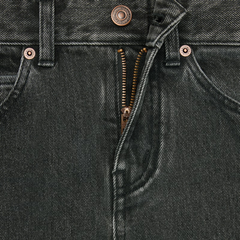 100%棉炭灰水洗色经典版型低腰喇叭裤腿5个口袋正面口袋设有饰钉腰部背面设有贴饰背面毛边拉链和纽扣镌刻CELINE JEANS字样 日本制造编号:2N62B932F.38CH