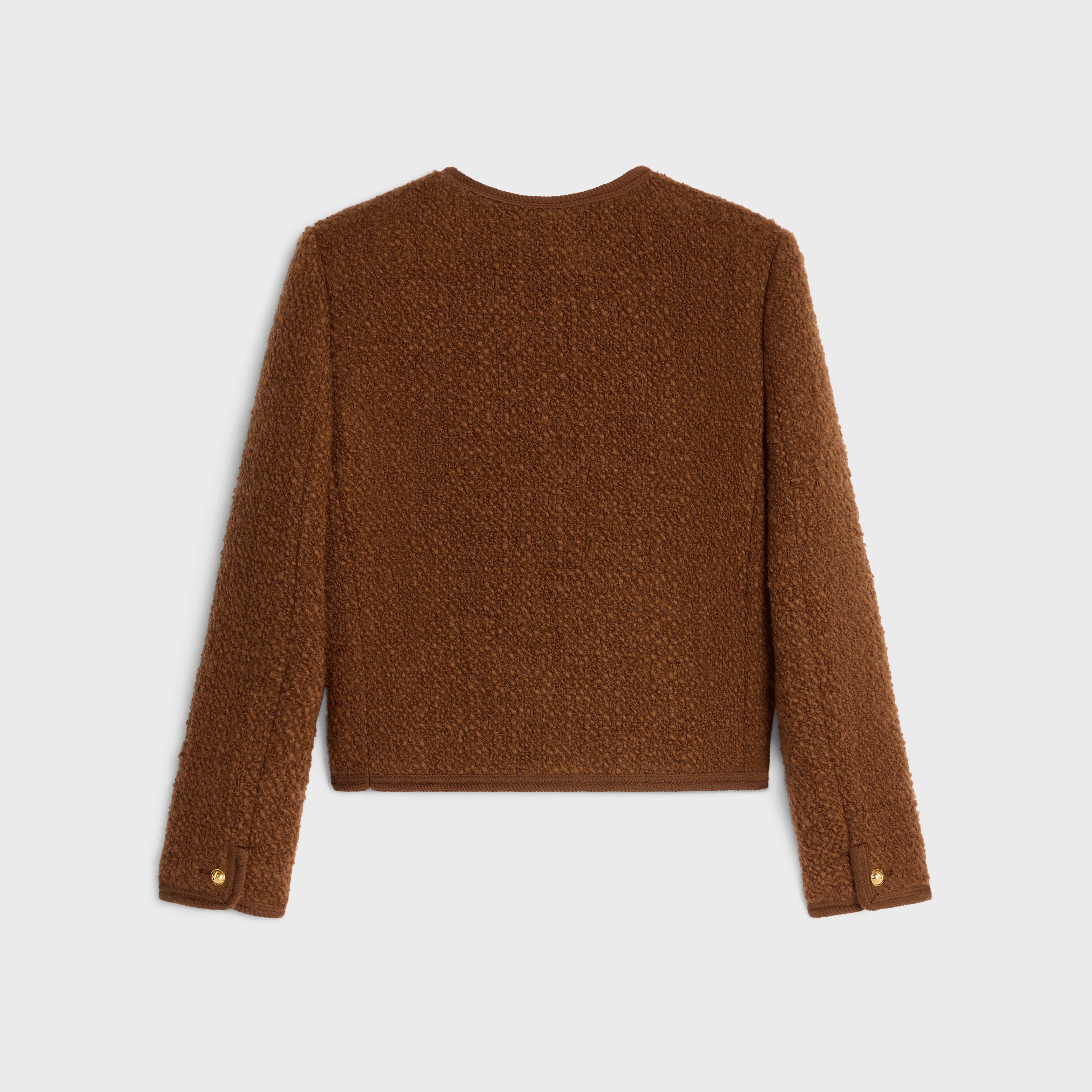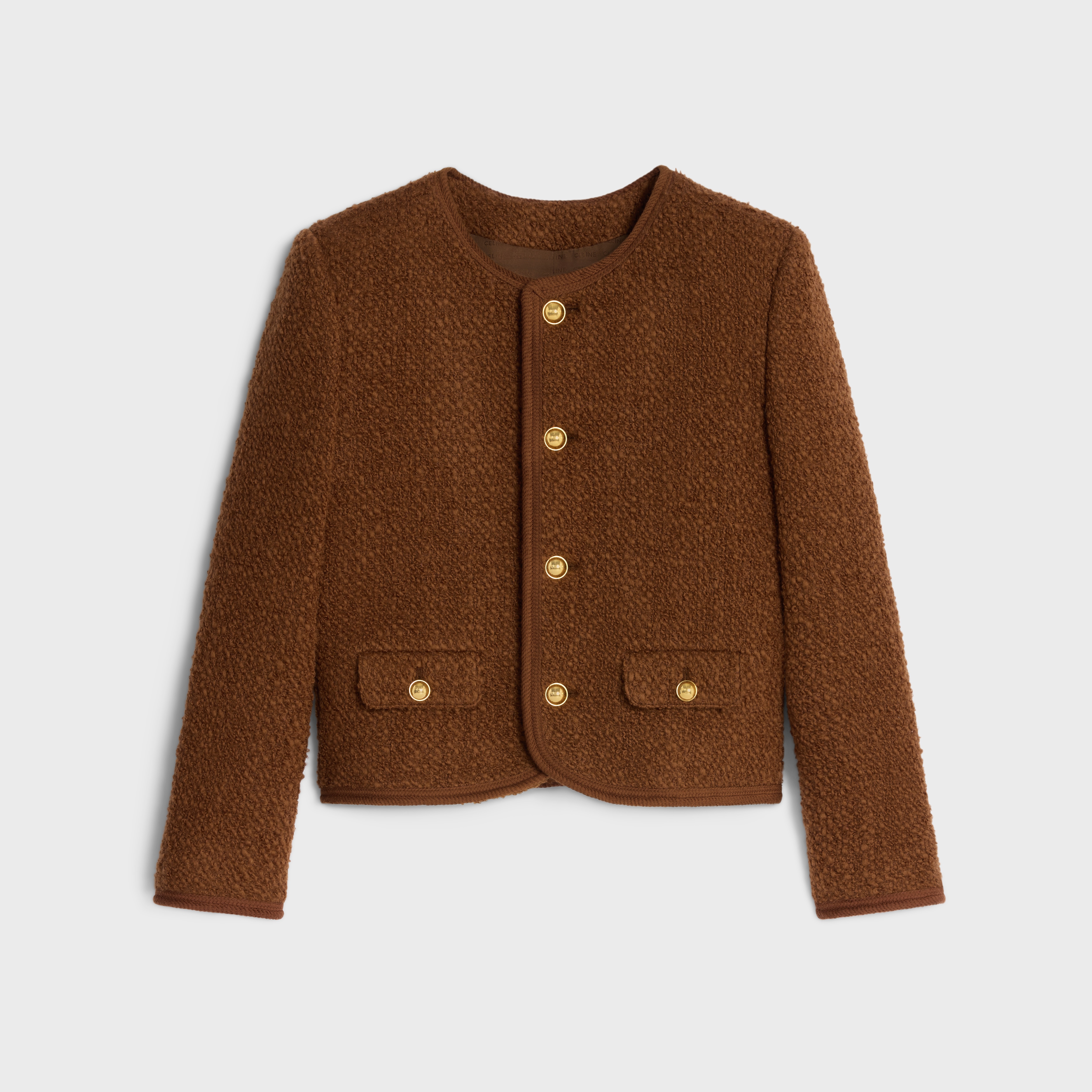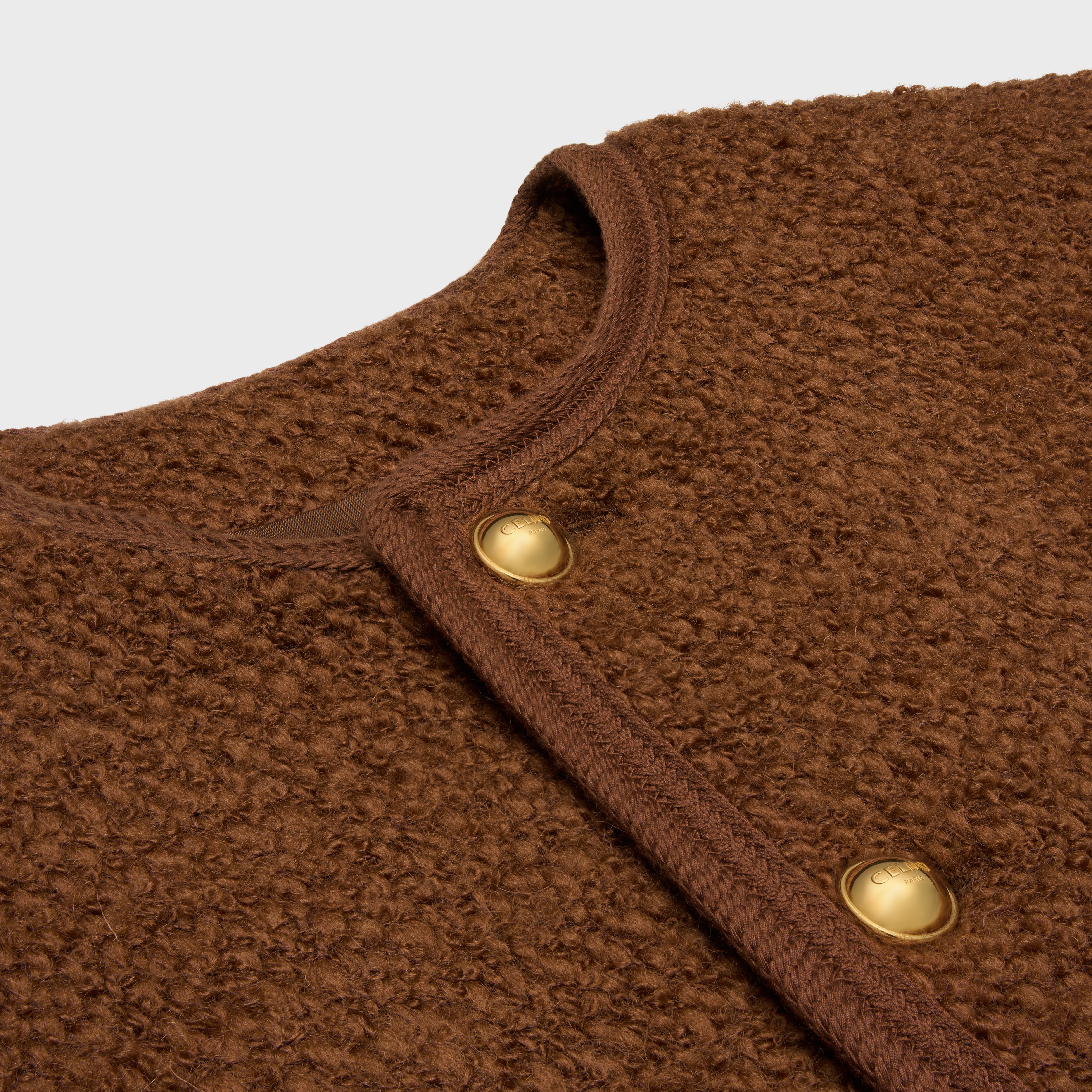 84%羊毛,10%马海毛,6%锦纶衬里:50%莫代尔纤维,50%粘纤门襟衬里:84%羊毛,10%马海毛,6%锦纶经典版型精裁垫肩圆领2个翻盖口袋编织滚边细节4枚镌刻CELINE PARIS字样的纽扣口袋饰1枚镌刻CELINE PARIS字样的纽扣袖口饰1枚镌刻CELINE PARIS字样的纽扣法国制造编号:2V17W227V.18NO