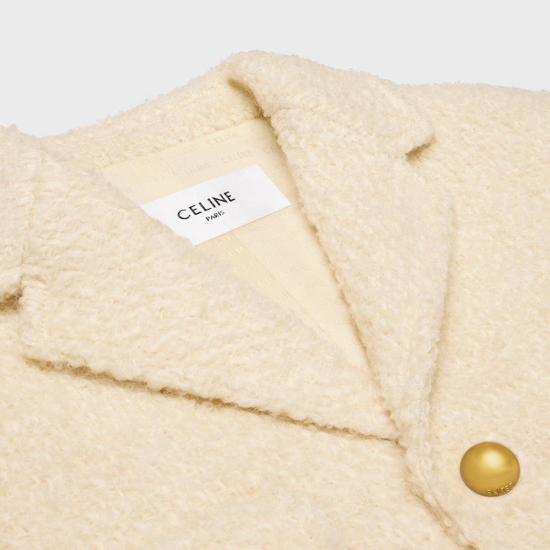 84%羊毛,10%马海毛,6%锦纶衬里:51%莫代尔纤维,49%粘纤经典版型平驳领4个翻盖口袋3枚镌刻CELINE PARIS字样的半球形纽扣口袋饰1枚镌刻CELINE PARIS字样的半球形纽扣袖口饰1枚镌刻CELINE PARIS字样的半球形纽扣法国制造编号:2V34W227V.01VA