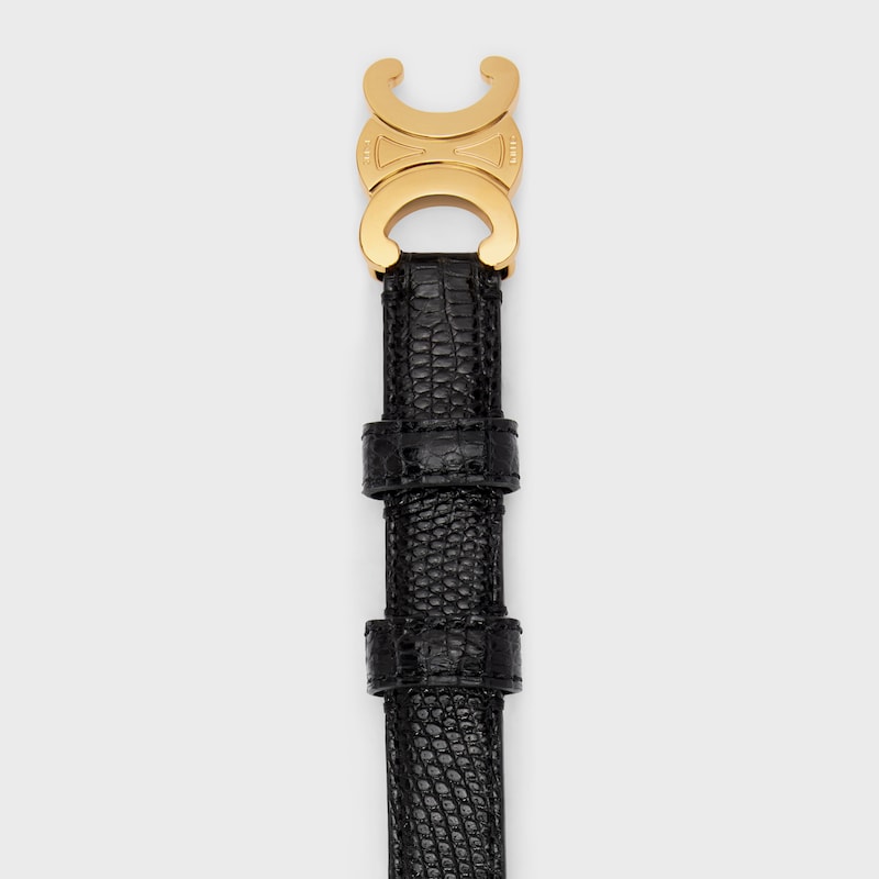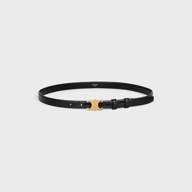 窄版腰带,带宽较细(1.8厘米),可搭配经典西装外套、裙装、牛仔裤,打造配套造型同款有中号腰带可选面层:蜥蜴皮革,底层:牛剖层革中腰宽度0.7英寸(1.8厘米)不可拆卸TRIOMPHE 搭扣编号:45AX64A79.38NO
