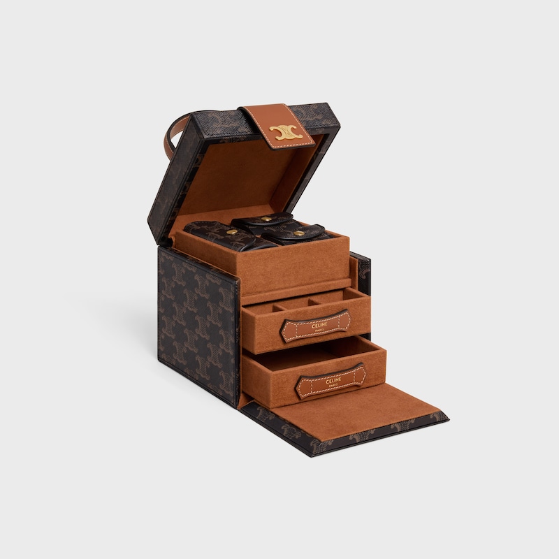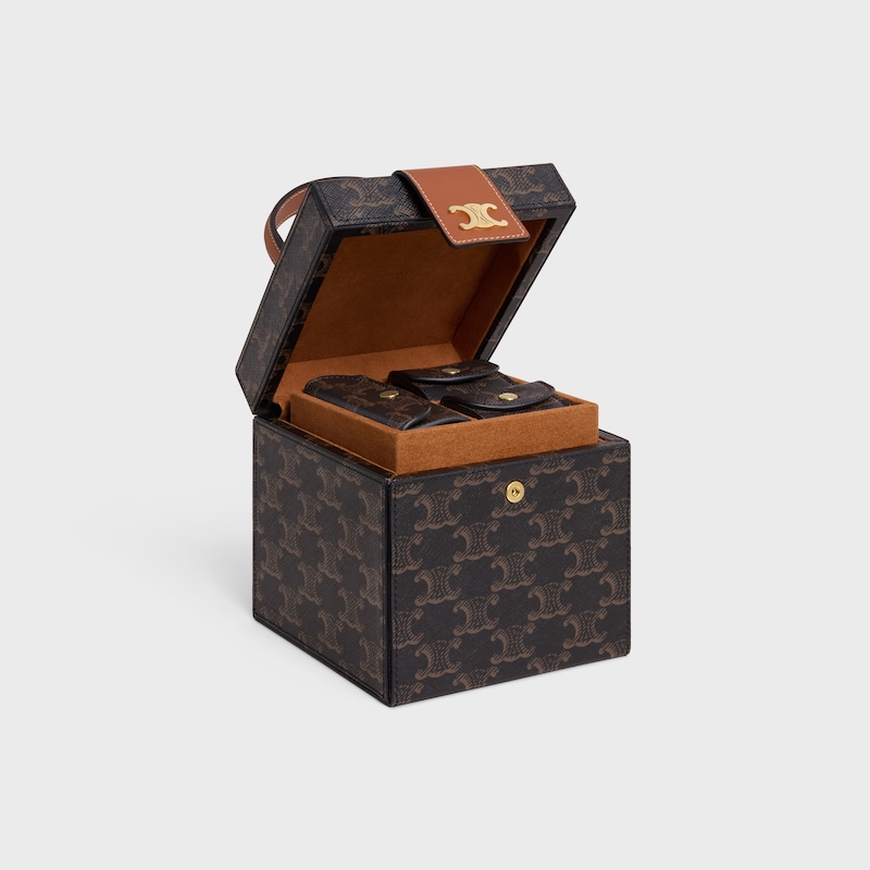 5 x 5 x 5英寸(12.5 x 13 x 13厘米) 标志印花,牛皮革包边织物衬里金属质感TRIOMPHE按扣开合2个耳环收纳袋1个戒指盒1个抽屉,设9个珠宝隔层1个抽屉,设1个隔层金色饰面编号:4M3812DIU.04LU