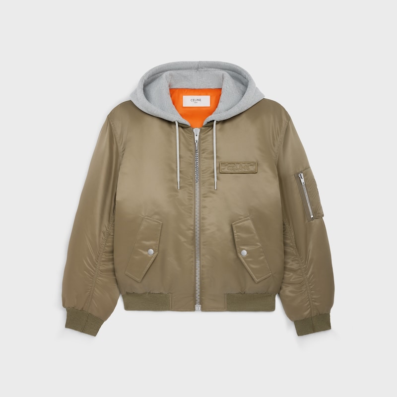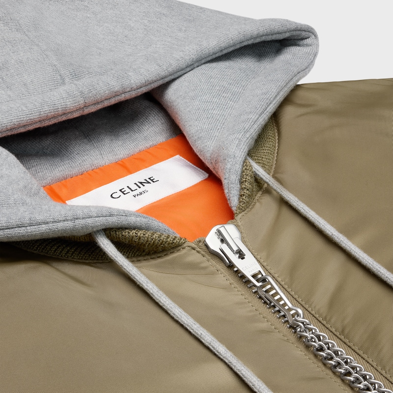 100%锦纶兜帽:100%棉衬里:100%锦纶填充物:100%涤纶胸前饰有CELINE魔术贴宽松版型兜帽,设有可调节抽绳,配以镌刻CELINE PARIS字样的金属端头2个翻盖贴袋,饰镌刻CELINE字样的按扣左袖设1个拉链口袋罗纹饰边拉链开合意大利制造编号:RV004889O.02KL