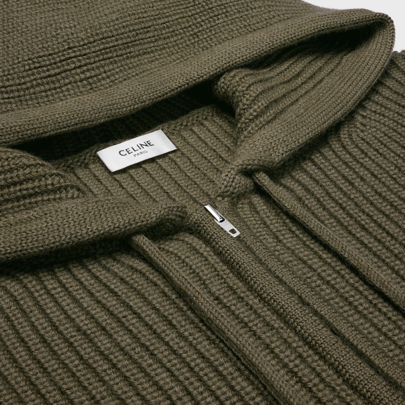 兜帽,设有可调节抽绳,配以镌刻CELINE PARIS字样的金属箍