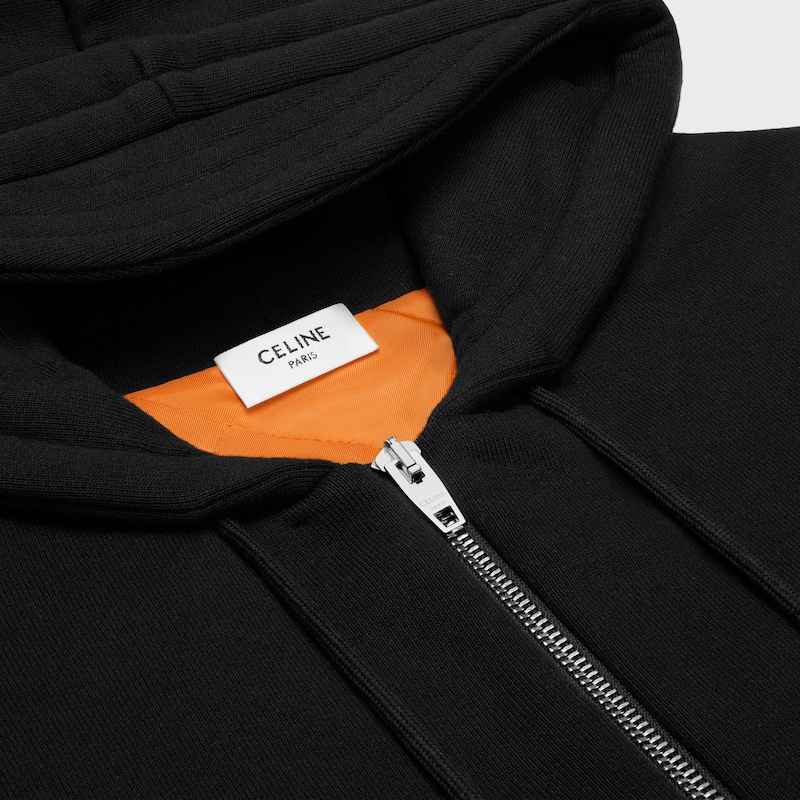 100%棉衬里:100%涤纶填充物:100%涤纶CELINE刺绣宽松版型兜帽,设有可调节抽绳,配以镌刻CELINE PARIS字样的金属端头兜帽带帽舌罗纹饰边1个开衩袋鼠式口袋拉链开合葡萄牙制造编号:RY04I345F.38AW
